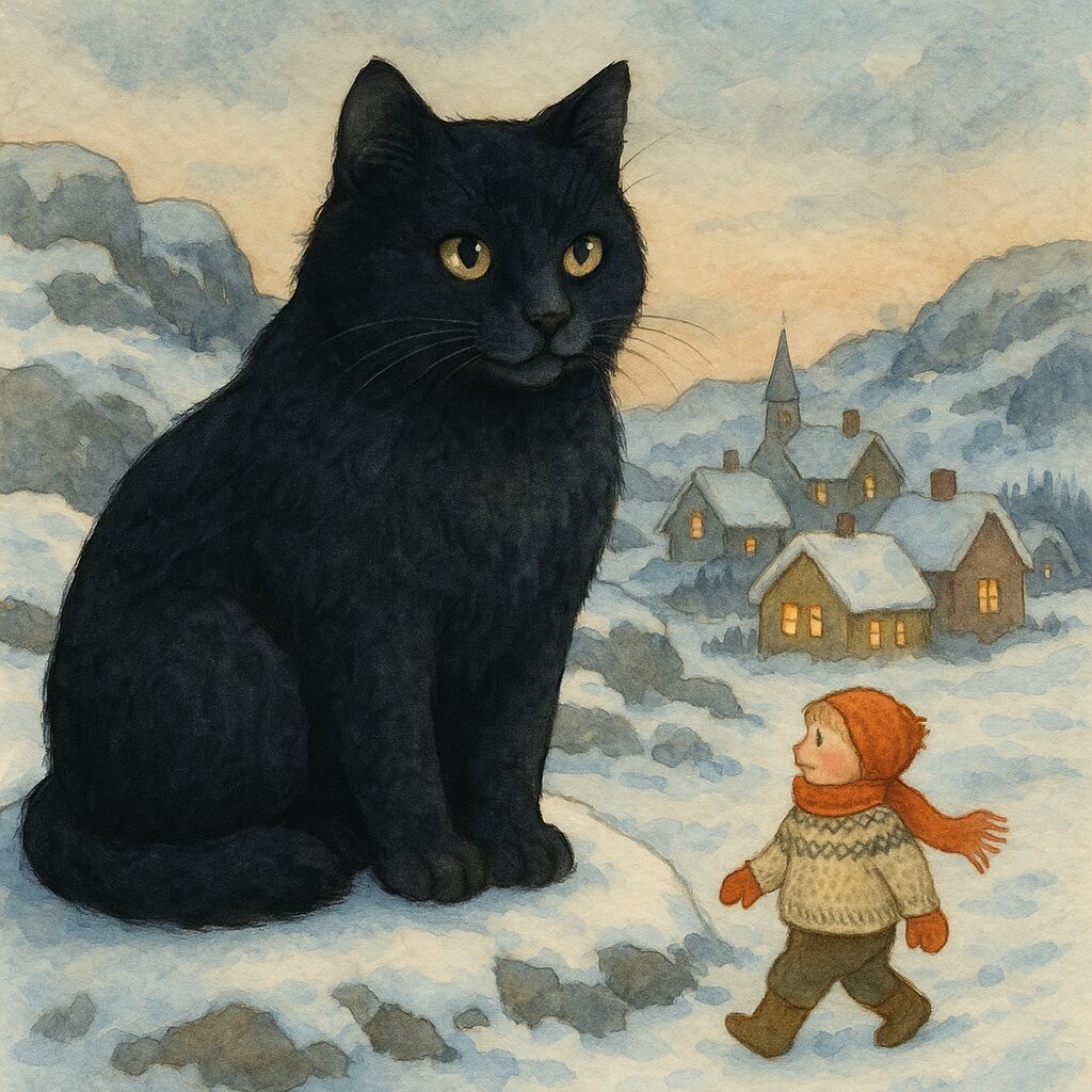In this one, it is Jólakötturinn (YO-la-KUH-tur-in), the Yule Cat. People say a giant black cat roams the snowy countryside at Christmas. Long ago, the story reminded children to help with winter chores so everyone could have warm new clothes.