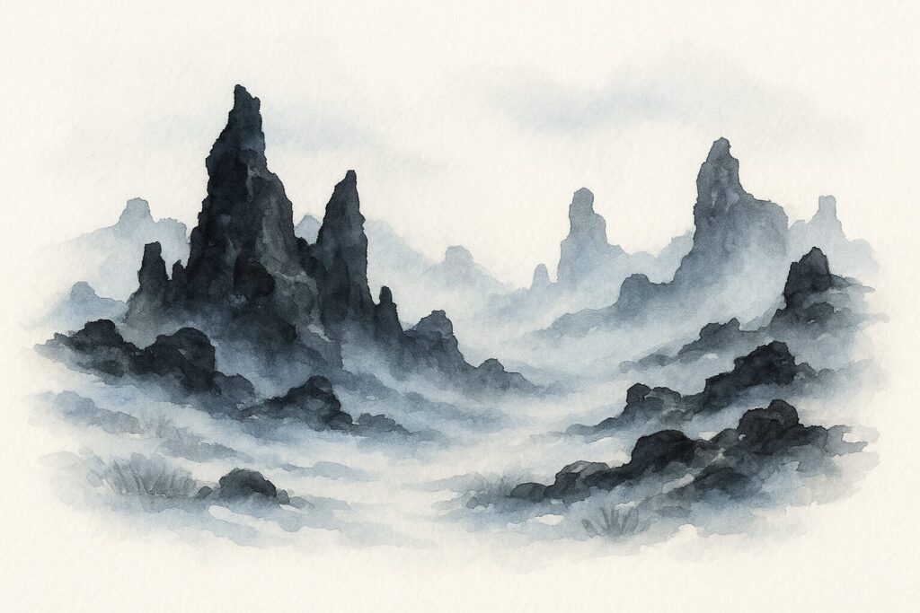Grýla lives in the strange black cliffs of Dimmuborgir (DIM-moo-borg-eer), where the rocks rise like frozen waves. The wind moves between them and makes sounds that could almost be singing. She walks that path every morning. She likes to see how winter is settling in, whether the frost is lying properly across the stones, and whether families in the valleys below might need a bit of unexpected kindness.